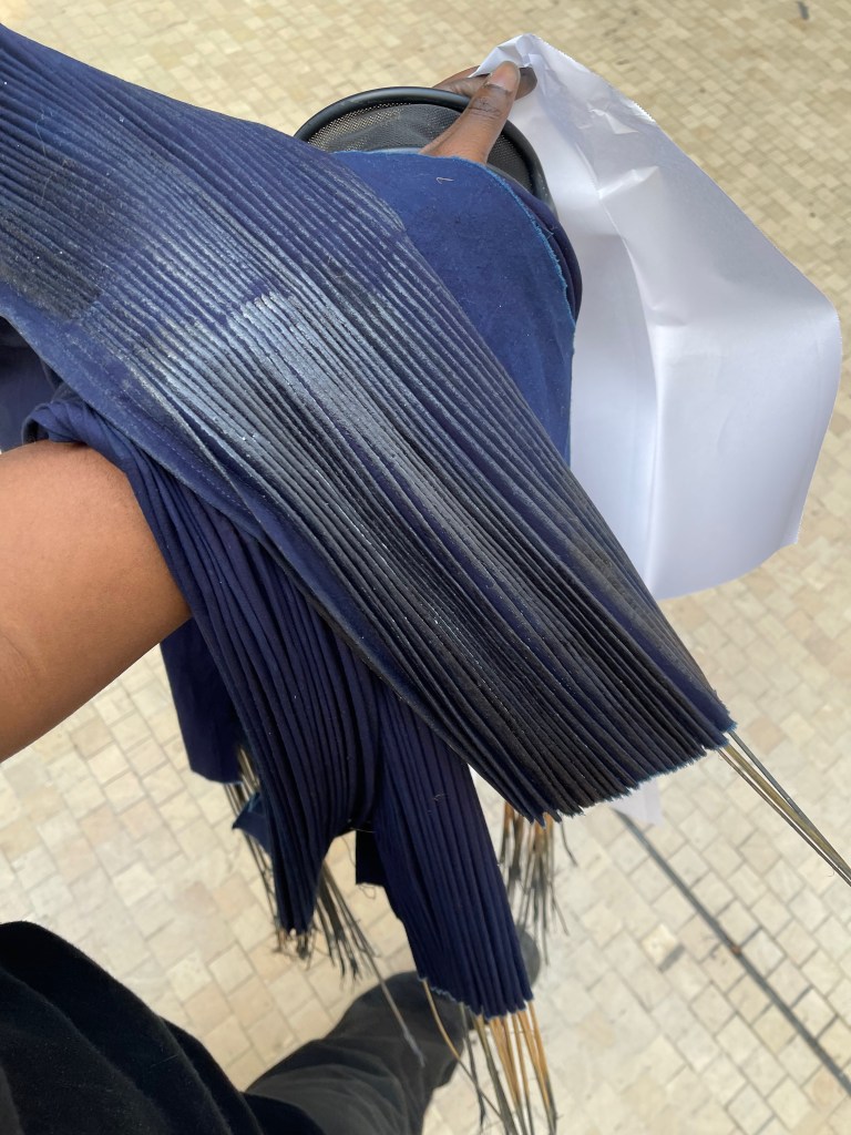 “The materials and techniques I used are deeply tied to my personal narrative. I sourced indigo-dyed textiles and leather from Kano, Nigeria, and incorporated waxed cotton sponsored by Barbour, a deliberate reference to the jackets I wore during my boarding school years. Alongside these, I worked with raw cottons, linen, and more unexpected materials like brooms and metal, all drawn from my surroundings. Every choice carries a sense of place and memory, grounding the collection in my lived experience.