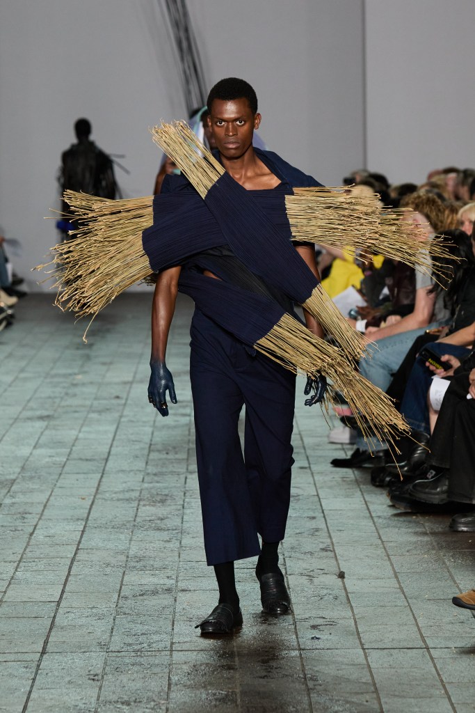 The collection was cohesive, each look masterfully moulded to the theme of collection. The use of African brooms in look 3 caught my eye, it was reminiscent of her CSM white show collection, yet different, a sculptural piece initially implemented to tell a story of the trauma we carry with as from her previous collection appears to tell a slightly different story now. The striking indigo blue, a colour known to convey introspection, perhaps the brooms now portrayed a reflection of self, history, that was my interpretation of said look. One of the marks of a truly great designer is their ability to recontextualize items, mundane or otherwise into something truly meaningful and we see this in the application of the broom in this look.