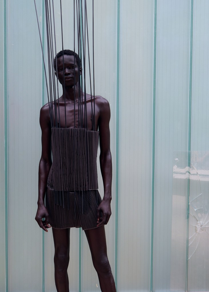 “The core concept behind my collection is an exploration of migration as a personal and emotional journey and how movement reshapes identity, memory, and the body. Craftsmanship and heritage sit at the heart of my process. Drawing on my Nigerian roots, I weave my past into every stitch, using materials and techniques that feel charged with history: wax, brooms, dyes, and unconventional textures.